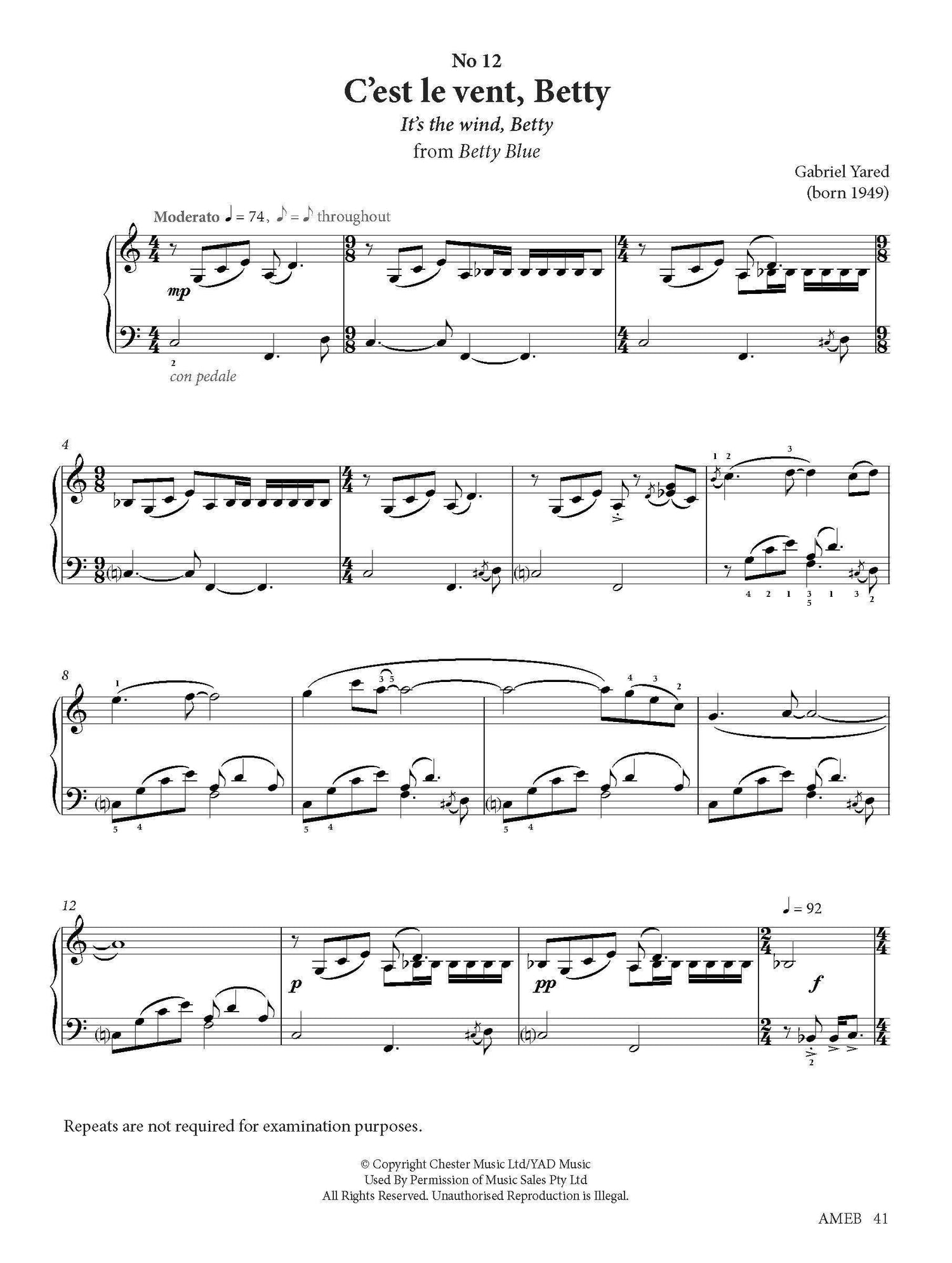 Mellow mood (Bailey) ♫ Bagatelle (Beethoven) ♫ Fix you (Berryman, Buckland, Champion and Martin arr. Keveren) ♫ Jucaro rumba (Brandman) ♫ Nuvole bianche (Einaudi) ♫ Pie Jesu (Fauré arr. Hodgson) ♫ Elegie (Gade) ♫ Nocturne (Gillock) ♫ Goodbye for now, but not forever (Levitt) ♫ Improvisation (Reger) ♫ Comptine d'un autre été: l'après-midi (Tiersen) ♫ C'est la vent, Betty (Yared) + Performance Notes