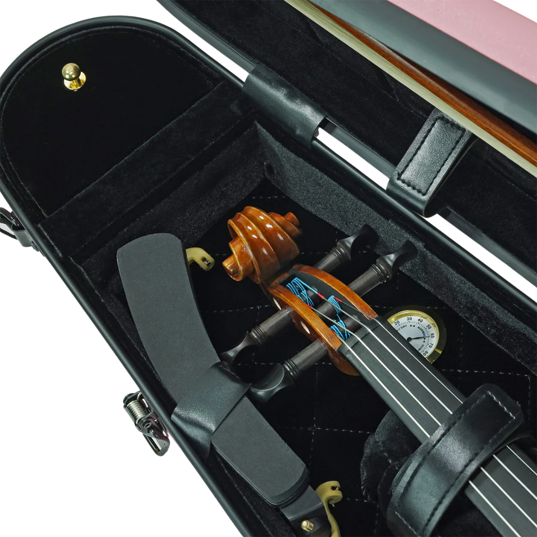 The ART Violin cases are made using a polycarbonate outer shell, which are strong, lightweight, and beautifully rich in colour. Padded backpack straps allow the case to be comfortably carried over the shoulder when on the move. Inside, you’ll find the modern functions and features that make ART Cases stand out from the pack. The inner lining is quilted, adding a luxurious feel to the case. A built in hygrometer lets you monitor the humidity, while the accessories compartment lets you store your bits and pieces away. The shoulder rest, and string tube strap, offers a spot to secure your items and minimise contact with your instrument. For added convenience, an adjustable neck block makes it possible to use the case over two sizes (4/4 and 3/4, 1/2 and 1/4, or 1/8 and 1/10).
