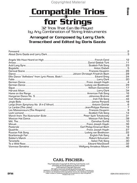If you have a couple of friends who play another instrument and you want to play some trios with them for fun or in a performance, then this is the book for you. This collection contains 32 trios in a variety of styles from classical to folk music to original pieces that will be fun to play with any combination of three string instruments. Trios are a great way to learn how to play in a chamber music setting and this unique collection gives you the opportunity to do it with anyone else who plays a string instrument – making the combinations of instruments that can be used extensive. Compatible Trios for Strings are perfect for use in school setting when students come in at lunchtime or after school and want to play for fun with their friends. The flexibility of these trios makes them a must-have for any string player.