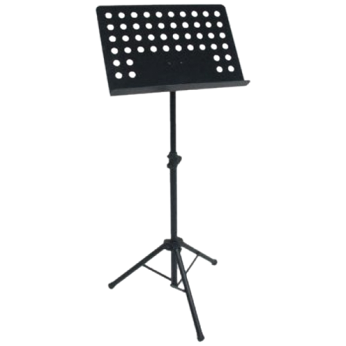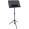 Lightweight, sturdy music stand with unique tubular construction - folding tripod legs, height adjustable. Lightweight, sturdy music stand with unique tubular construction - folding tripod legs, height adjustable. Unique to standard music stand construction, this stand's base is made of 1" dia. aluminum tubing with folding tripod legs similar to the speaker and lighting stands. Adjustable height to 46". The steel desk is patterned with cutouts to reduce weight and is angle adjustable. The base and desk are black coated.