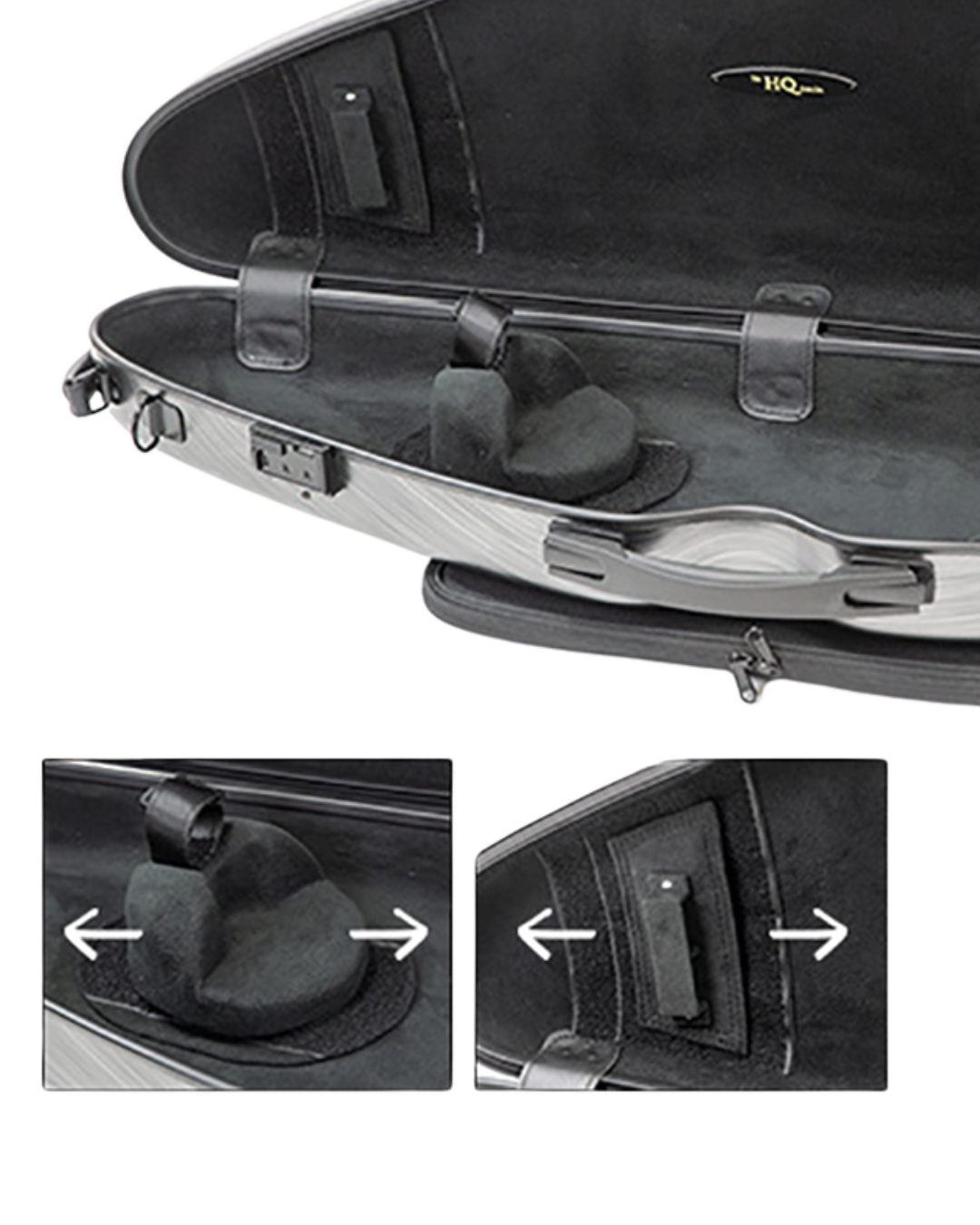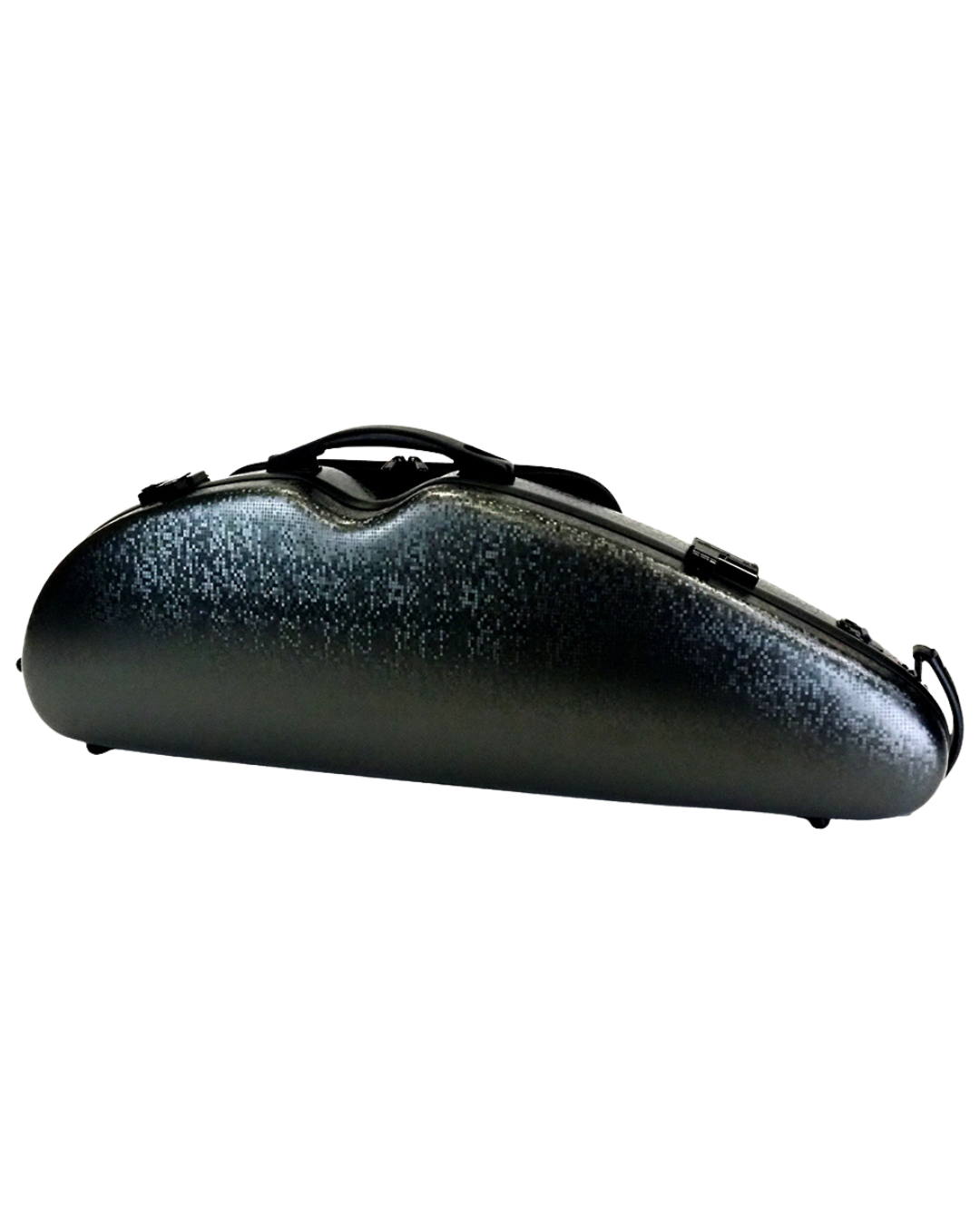 Lightweight HQ Polycarbonate half-moon violin case in DIGI black finish. This model has an adjustable neck support and adjustable length bow holder, which allows the case to safely accommodate anything from 4/4 down to 1/2-size violin. Features removable external music pouch, 2 bow holders, combination locks and padded shoulder straps.