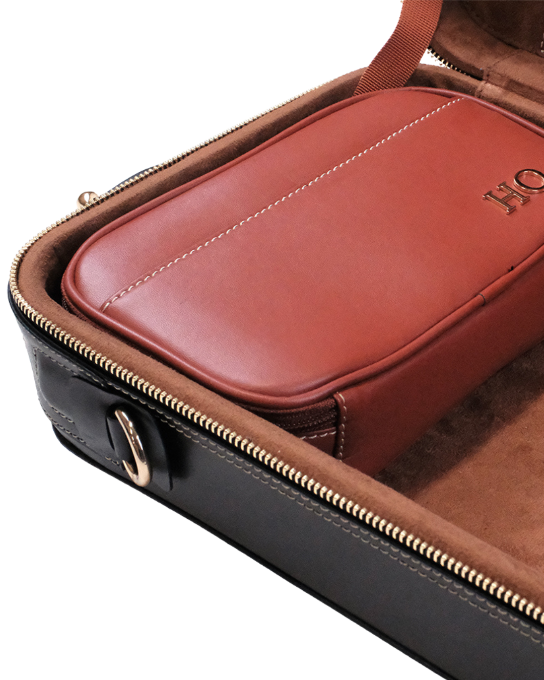 HQ professional-grade oblong case using strong carbon-fibre shell with Italian leather outer for the classic traditional appearance. Deer leather lined interior, 4 bow holders, and gold-metal fittings throughout.