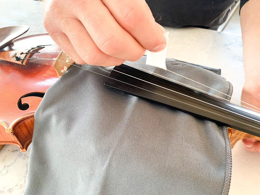 • Lay a cloth cover underneath the fingerboard to protect the varnish from any contact with the liquid. We recommend the Leatherwood Rosin cleaning cloth
