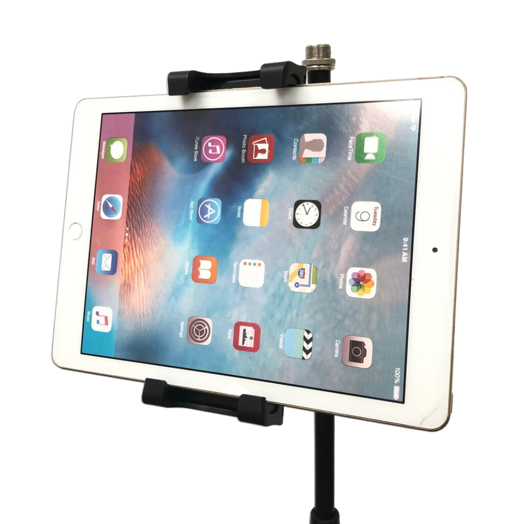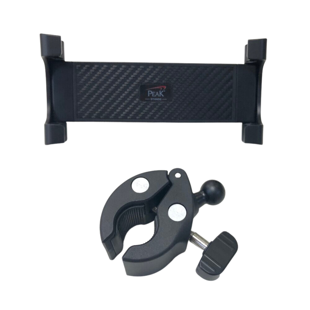 The E-Device holder by Peak is a clamping system that can hold any electronic device from a phone up to an iPad Pro.  Both clamps have silicon padding to make sure your device is held securely and safely.