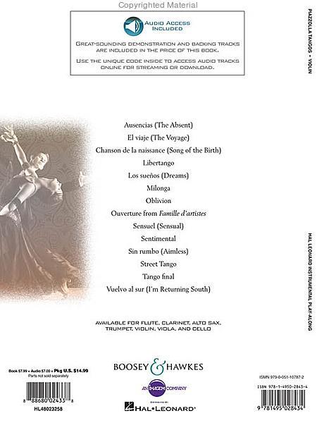 14 of Astor Piazzolla's most famous tangos are now playable for budding instrumentalists in this collection featuring solo arrangements and great-sounding demonstration and backing tracks available online for download or streaming. Songs include: Ausencias • Chanson De La Naissance • El Viaje • Libertango • Los Suenos • Milonga • Oblivion • Ouverture • Sensuel • Sentimental • Sin Rumbo • Street Tango • Tango Final • Vuelvo Al Sur.