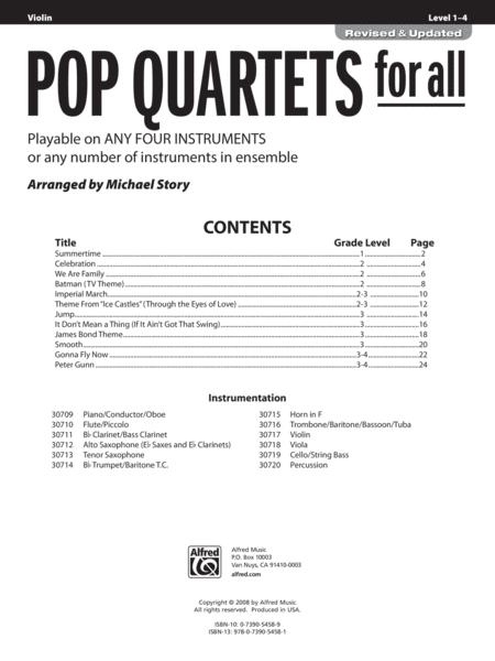 Alfred's Pop Quartets for All series is a versatile, educational, and fun series intended for like or mixed instruments to perform in any size group or combination of instruments. All books are in score format with each line increasing in difficulty from Grade 1 to Grade 3-4. Alternate passages and notation are included to suit instrumental ranges. With no page turns required, the songs and measures are consistent which makes finding rehearsal points quick and convenient. Perfect for concerts with family and friends, recitals, auditions, and festivals. Available for brass, woodwinds, strings, and percussion.