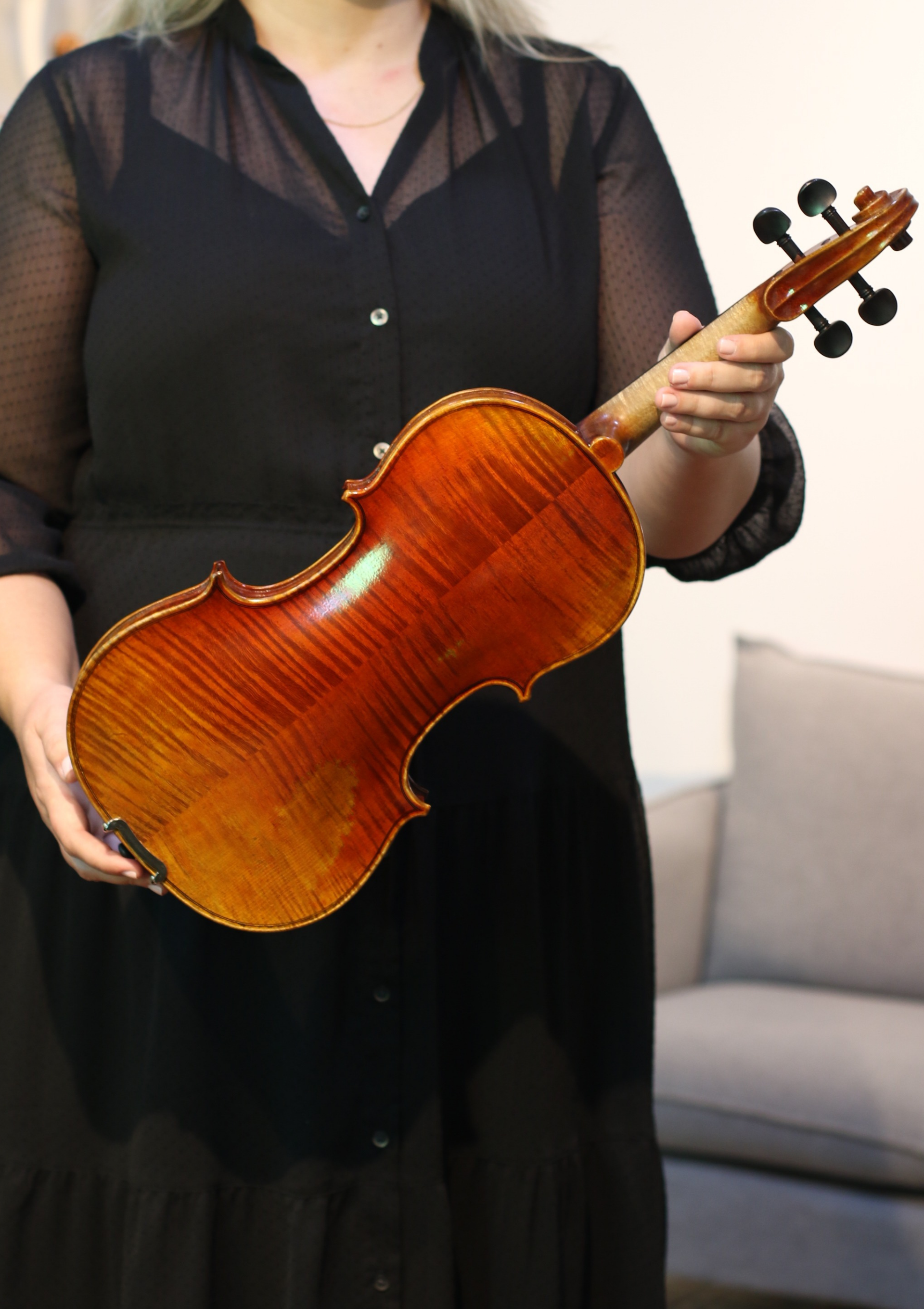 The Rococo offers a rich and complex tone, with powerful and direct projection. More nuance is available to the advancing player, with a velvety bass register and a singing treble. It provides excellent value for money, with high-quality tonewoods and improved arching aiding in improved sound projection. The Rococo range has the high-level detailed antiquing and aged tone reminiscent of vintage instruments. The Rococo is highly flamed, slightly antiqued, and has a dark reddish with golden ground varnish. The Rococo has quickly become a staff favourite at Simply for Strings.Sound Profile