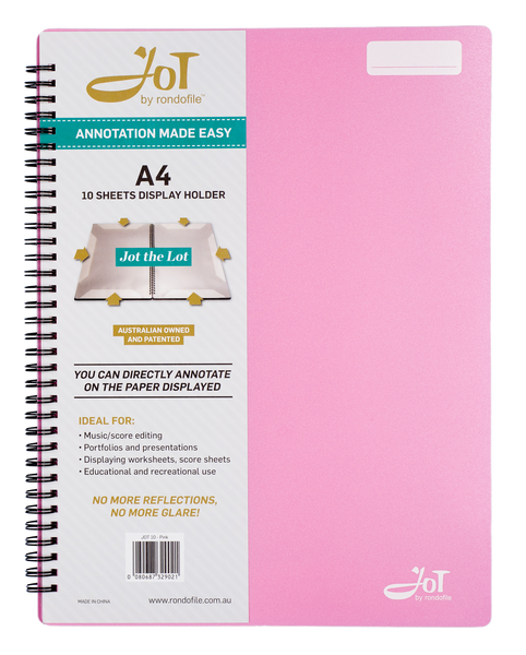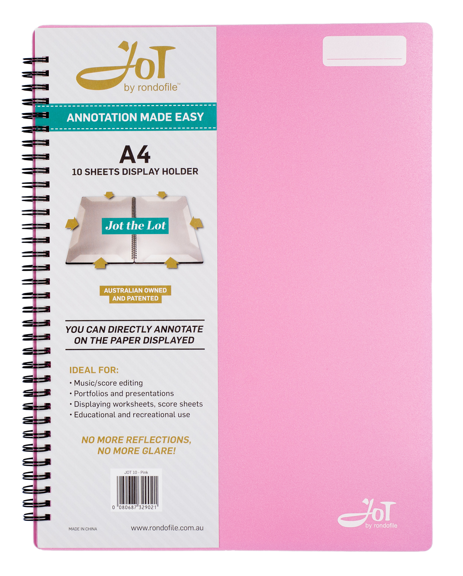 The JOT folder is a Rondofile 10 page display folder. The quality of the patented Rondofile sheets inside the JOT folder is the same high quality sheets as found in the Rondofile 20 & Rondofile 30 Display BOOK folders. Besides music, this product is design to provide a slimmer display filing folder for general all-purpose use, as well as for those musicians and all alike who do not require so many sheets.