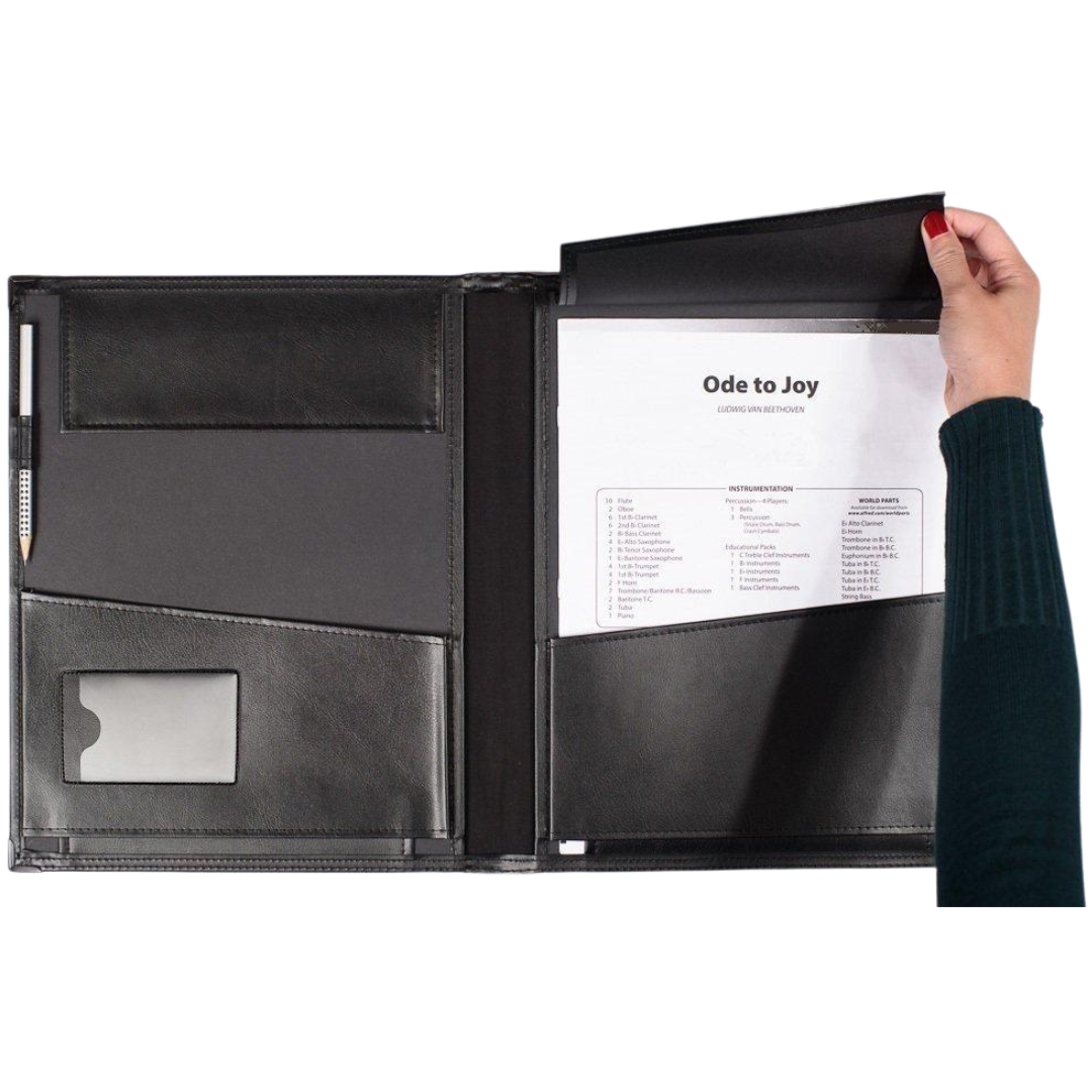 • Two fold-over flaps holding music securely during transport
