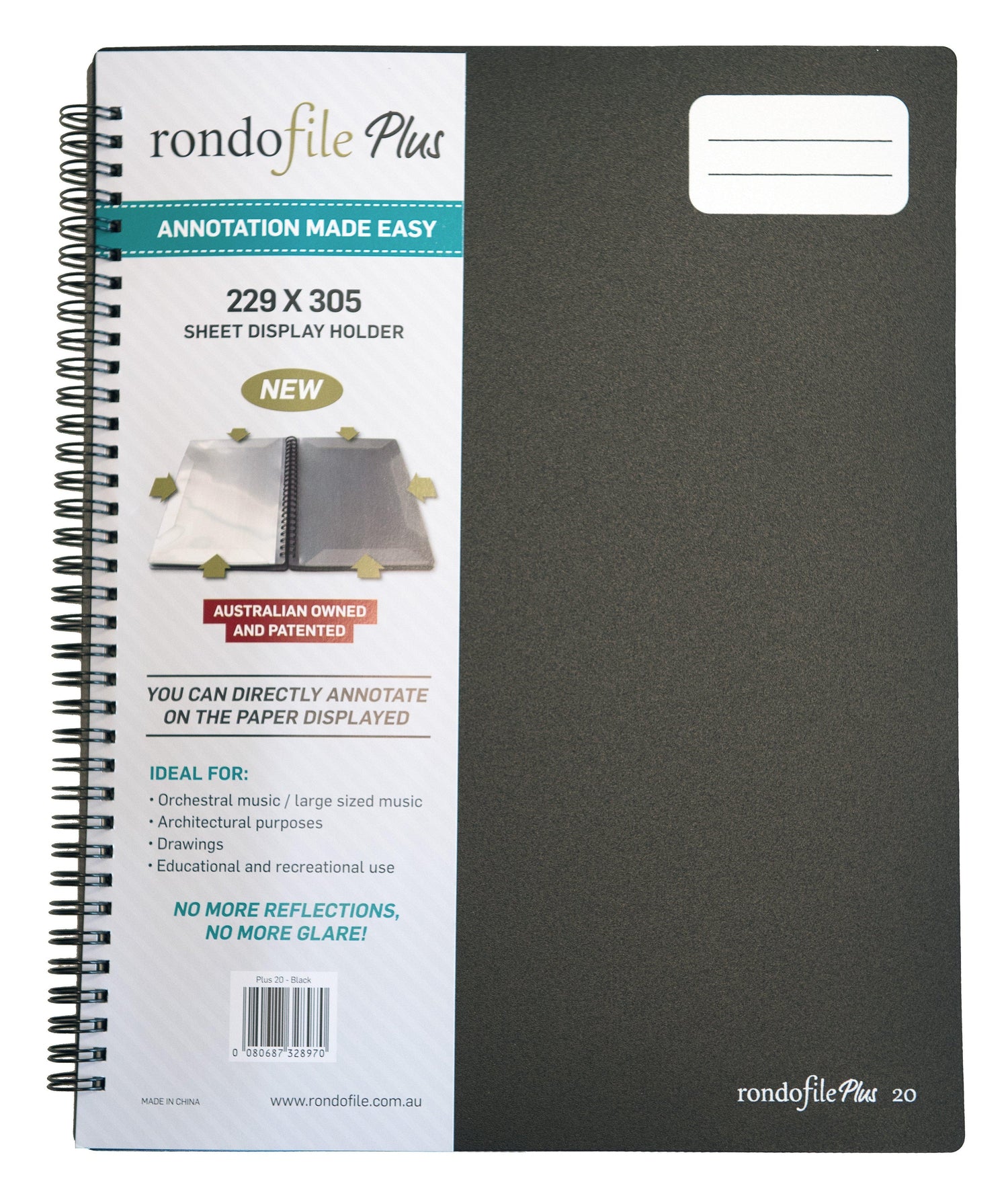 The Rondofile Plus 20 (20 sheets, black cover) is a specialised folder with larger than A4 sized Rondofile Sheets - 229mm x 305mm or 9 inch x 12 inch. The aim of this folder is to accommodate and fit the larger sized (American and Canadian) Orchestral and Band music scores and charts. Since it is slightly larger than A4, it can also accommodate A4 music sheets comfortably and snugly, which gives this folder an additional extra benefit.