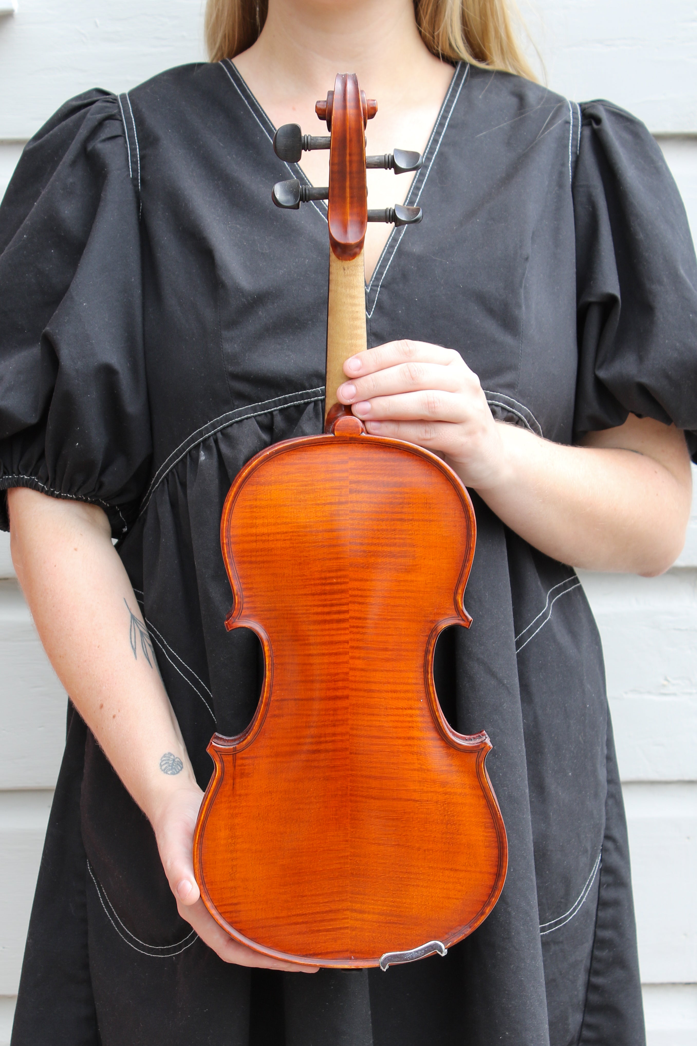 Advanced student instrument. Similar specifications to ‘Gliga II’ but with better grade timbers and more handwork attention to plate thicknessing and outline contour on body and scroll producing an outstanding instrument for the advanced student. The versatile violin delivers a robust performance and a full range of tonal colours for both solo and orchestral work. Offered in a dark 'Antiqued' finish, which is beautifully refined to produce exceptionally attractive instruments. The ebony fittings and maple bridge are fashioned in the Gliga workshops.