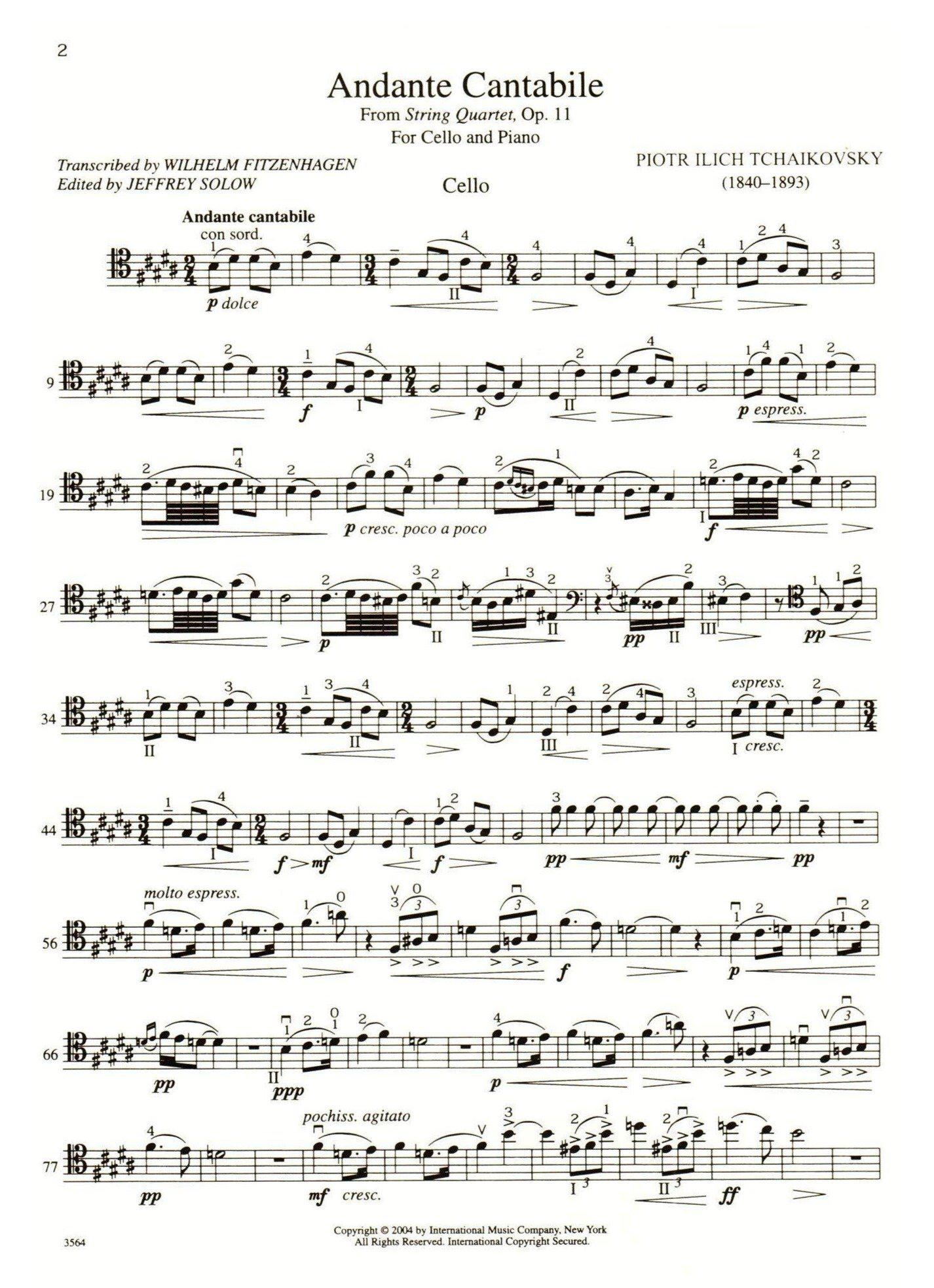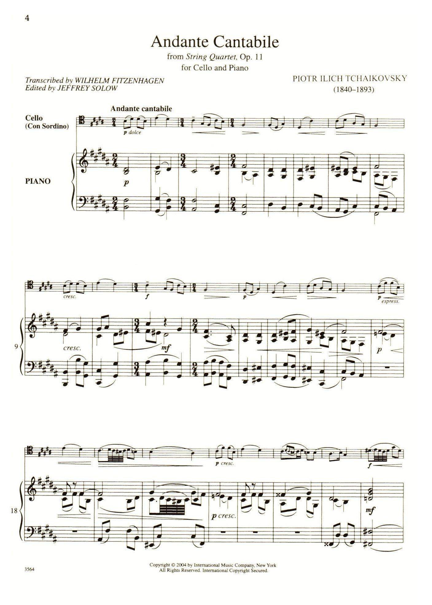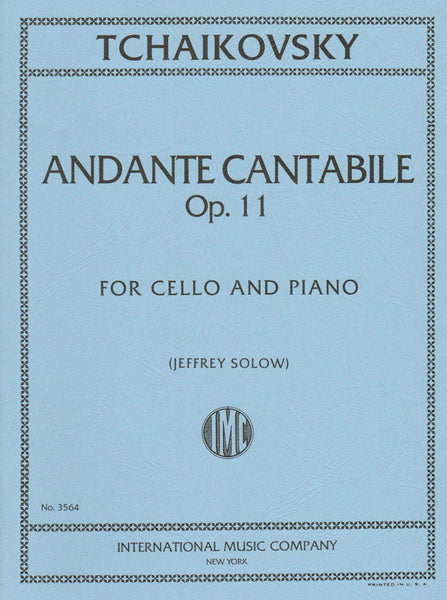 Andante Cantabile is the famous second movement from Tchaikovsky's String Quartet Number 1, Opus 11.  Known for it's beautiful lyricism, the movement translates very well to the cello with piano accompaniment.Published by International Music Company.