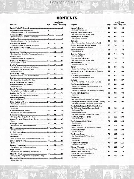 Contains 60 songs, including: Cantina Band * Follow the Yellow Brick Road / We're Off to See the Wizard * Gollum's Song * Hedwig's Theme * James Bond Theme * Obliviate * Pink Panther Theme * Raiders March * Superman Theme * Wonka's Welcome Song * and many more.