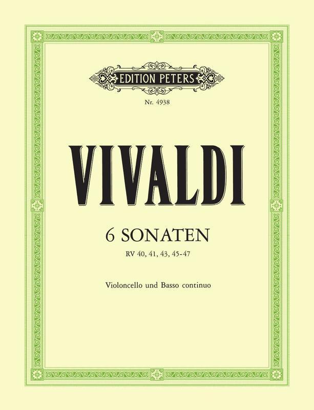 Antonio Vivaldi: 6 Sonatas for Violoncello and Basso continuo (Cello and Piano), with 2nd cello ad lib. Contents: RV 47(Bb); 41(F); 43(a); 45(Bb ); 40(E); 46(Bb). Edition Peters, edited by Hellmann.